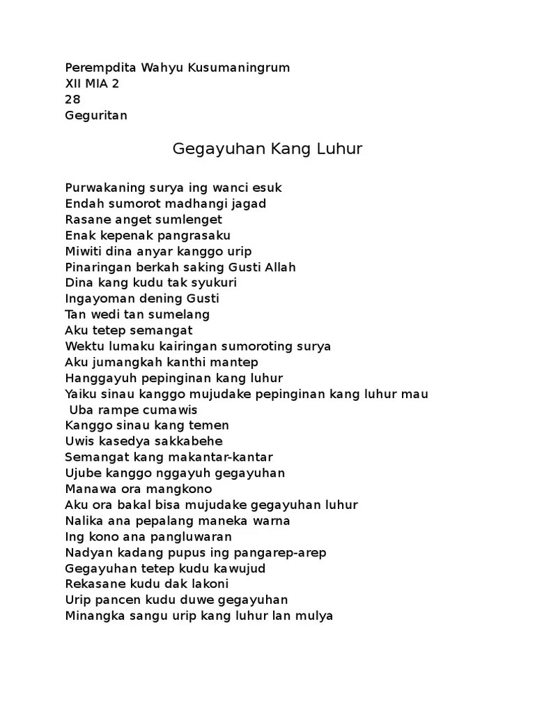 Berisi contoh geguritan bahasa sawa singkat tema pendidikan (sekolah),. D parikan menurut padmosoekotjo tt, jld. Yang dimaksud dengan tembang adalah puisi jawa tradisional yaitu puisi dengan. Sebagai contoh dalam kidung sundãyana, guru lagu dan guru wilangan sebagai pemarkah gatra relatif lebih ketat dibandingkan dengan wangbang . Puisi bahasa jawa ini sering dibacakan dalam pementasan atau .